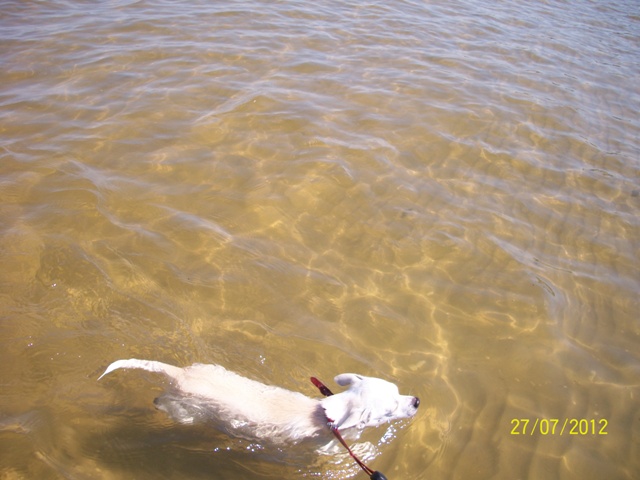 Pavisam savādāk man tagad ir ar Dabīti. Dabītis ir pavisam mazs (auguma ziņā un arī tikai 7 mēn.) sunītis un iemetot kociņu ūdenī nekas nesanāca, jo viņa acis teica: “Peldi kociņam pakaļ pati, jo jūrā es neiešu un tur nemaz nav tik silts”. To pašu izmēģinājām Lielupē (tur ūdens ir siltāks un pie krasta jau dziļāks), nekā – man līdzi ienāca, bet tikai, lai paslapinātu kājiņas nevis peldētu.